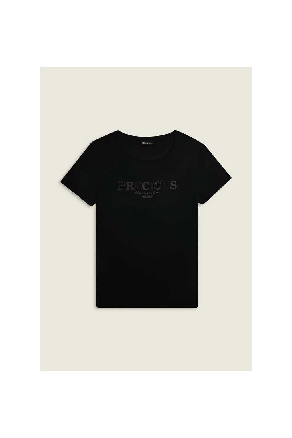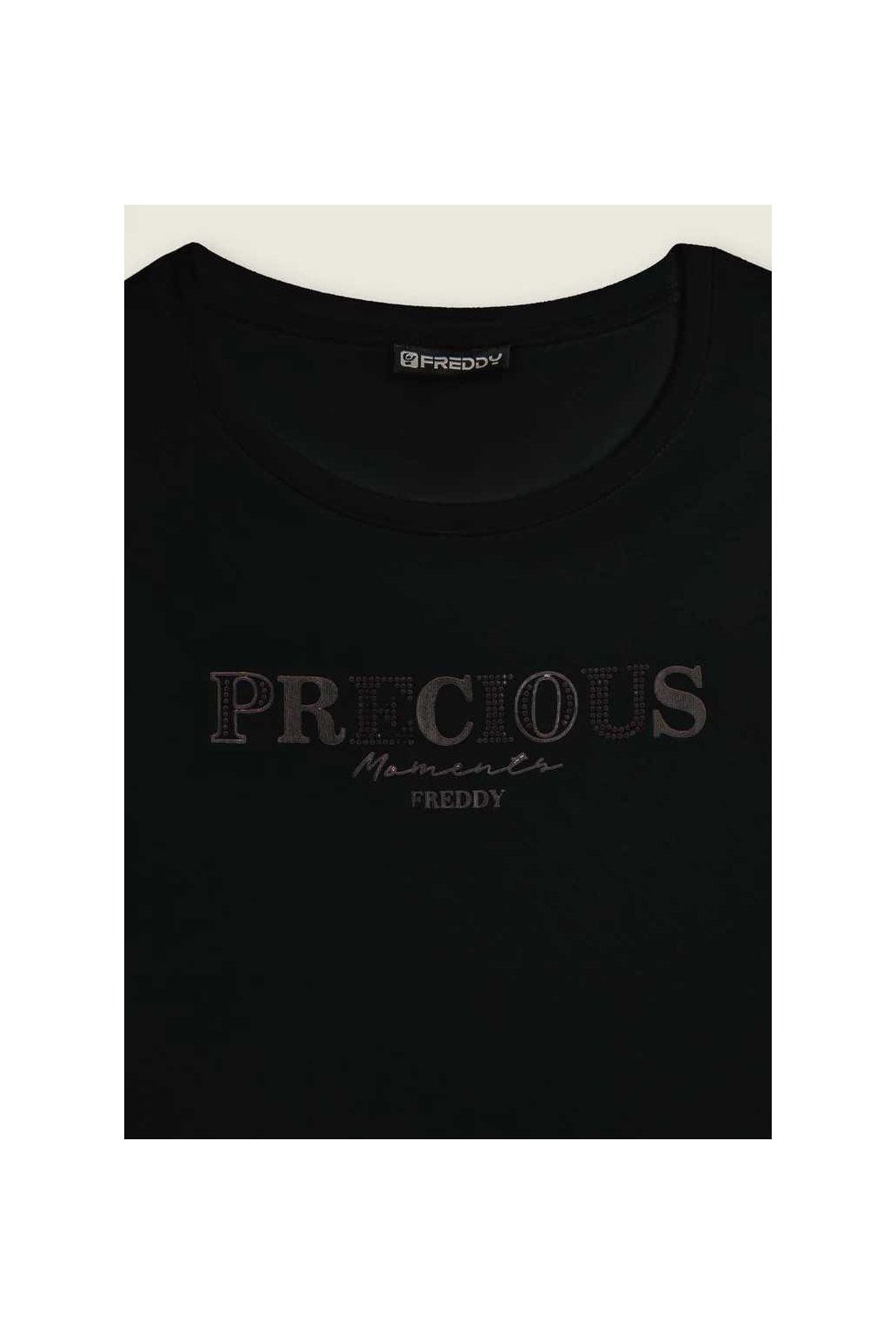 FREDDY Fekete női póló „Precious Moments” strasszköves felirattal F25WTEET7, N