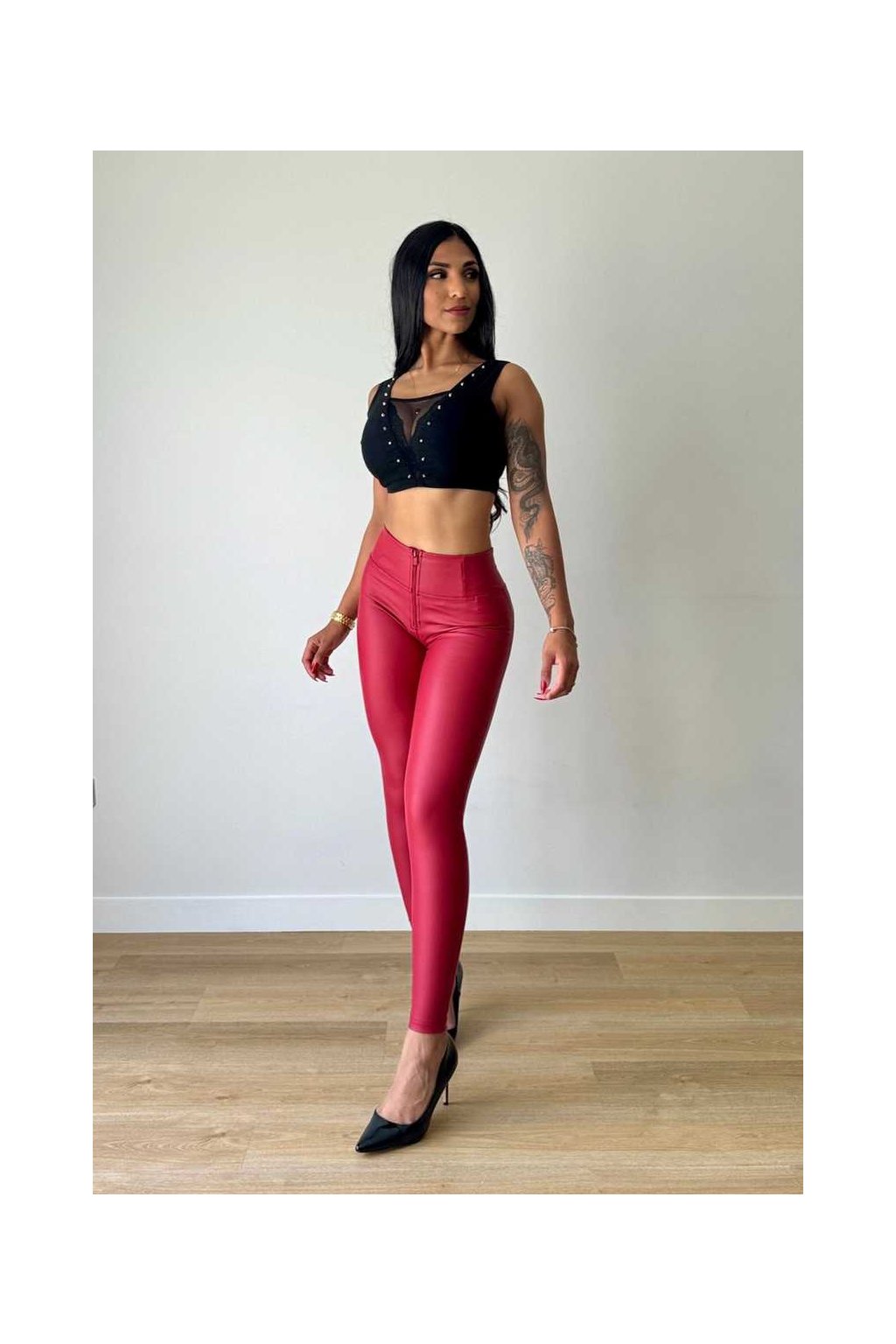 Piros magas derekú műbőr nadrág- piros cipzár