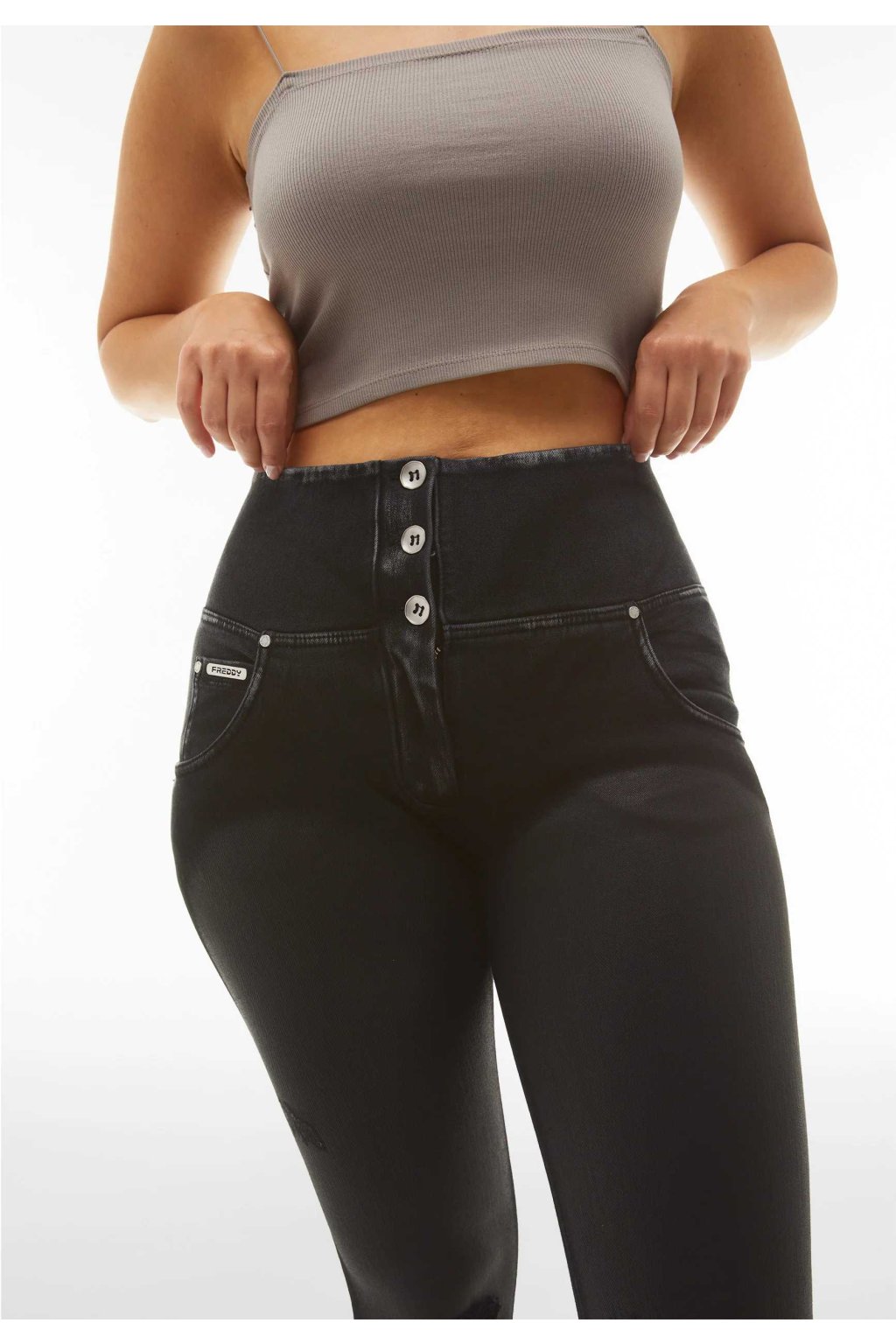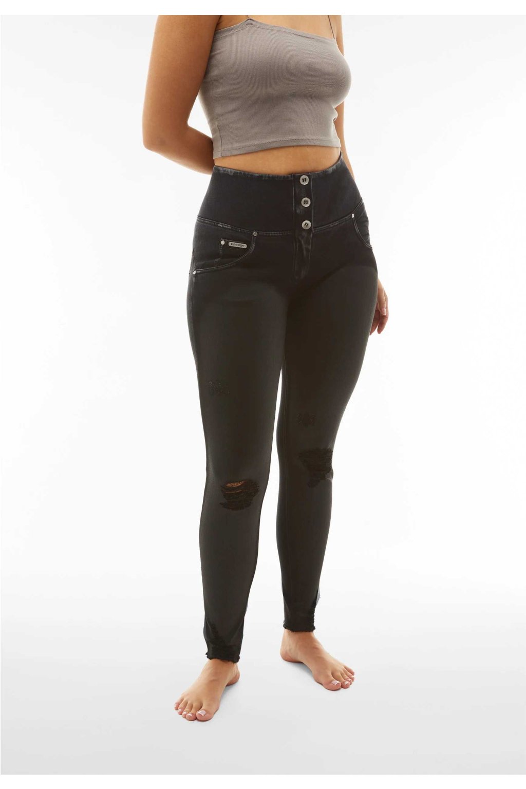 WR.UP® SNUG Magas derekú fekete superskinny szakadt farmer gombokkal, vastag anyag