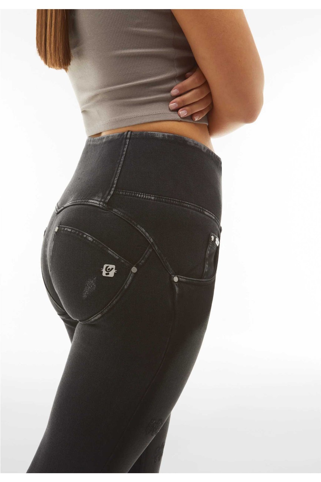 A WR.UP® push up szakadt farmernadrág környezetbarát fekete, rugalmas, shuttle-szövésű denim anyagból készült, elöl bevonattal. Ideális választás bármilyen öltözékhez, amely kiemeli az alakot anélkül, hogy korlátozná a mozgásszabadságot. A nadrág autentikus megjelenését a klasszikus, valódi ötzsebes kialakítás és a fém szegecsek adják, amelyek harmonikusan illeszkednek a fenntartható szemlélethez.